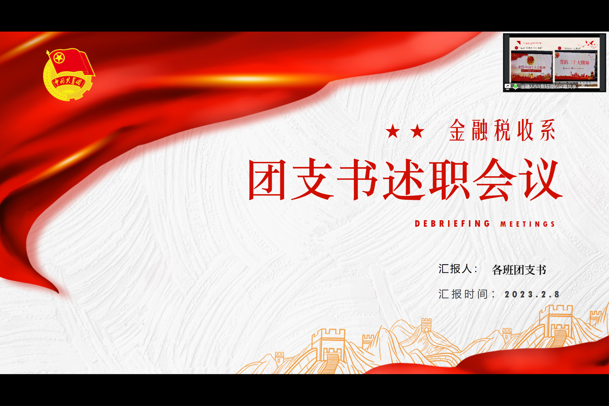 为了压实基层团支部书记责任,加强各班团支部学习交流,提高团干部服务同学的意识以及履职能力,推动基层团的引领力、组织力、服务力和贡献力协同提升。2023年2月8日下午,beat365英国官方网站金融税收系团总支2022年度基层团支部述职大会通过腾讯会议平台顺利召开,系团总支书记胡婉君老师、团组学生干部和各班团支部书记共44人参加。