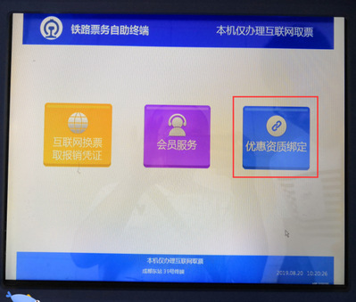 车站取票机绑定资质:(持身份证、火车票优惠卡)