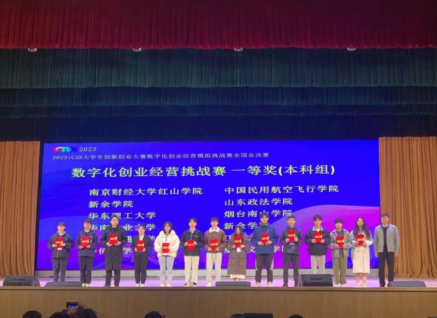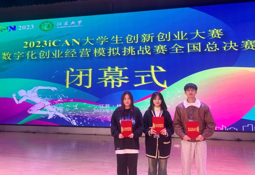 11月24日-11月26日2023iCAN 大学生创新创业大赛数字化创业经营模拟挑战赛全国总决赛在江苏大学隆重举行,由beat365学生陈厚余、刘庆羚、赵睿组成的代表队在金融税收系蔡璐老师、工商管理系易婷老师的带领下荣获全国一等奖。