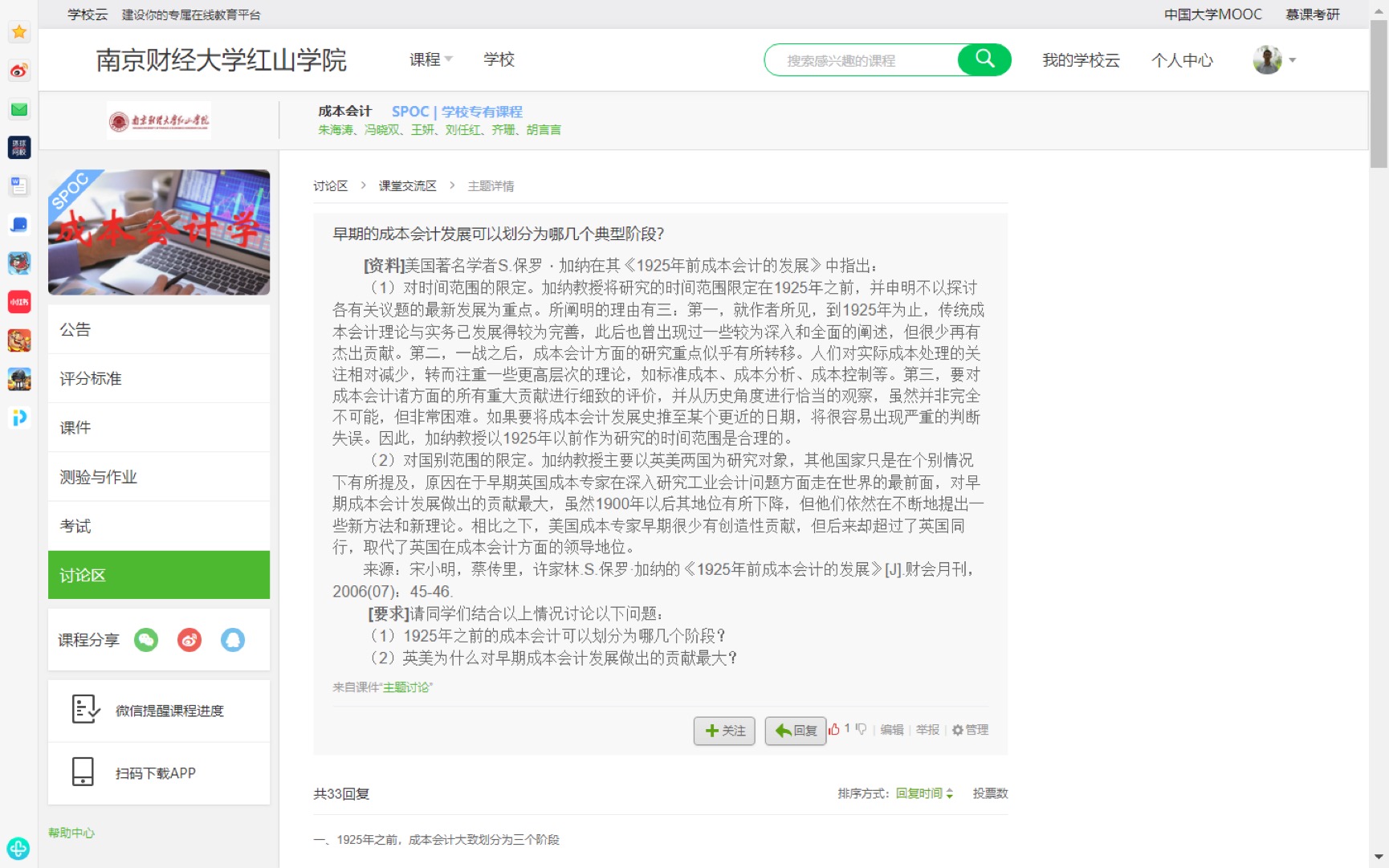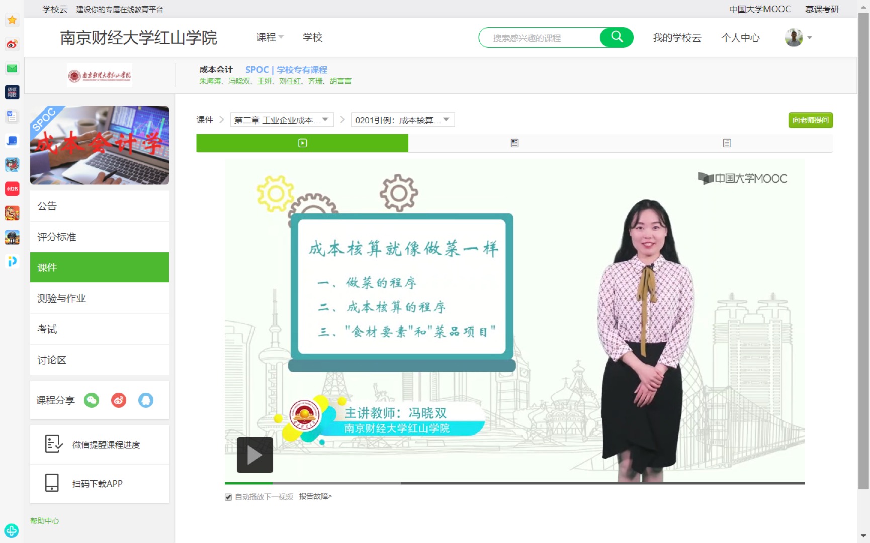 经过开学前的认真准备和开学两周以来的线上教学活动,使得江苏省高校在线开放课程《成本会计》的教学改革,经历了“确立课程建设目标——遴选教学知识点——建设教学大纲——凝练趣味化标题——制作课件与脚本——设计习题及讨论题——录制教学视频——分工上传教学资源——交叉审核修改——完成在线课程建设”多个阶段,这一系列精准科学的课程建设工作,切实保障了本课程的教学质量。