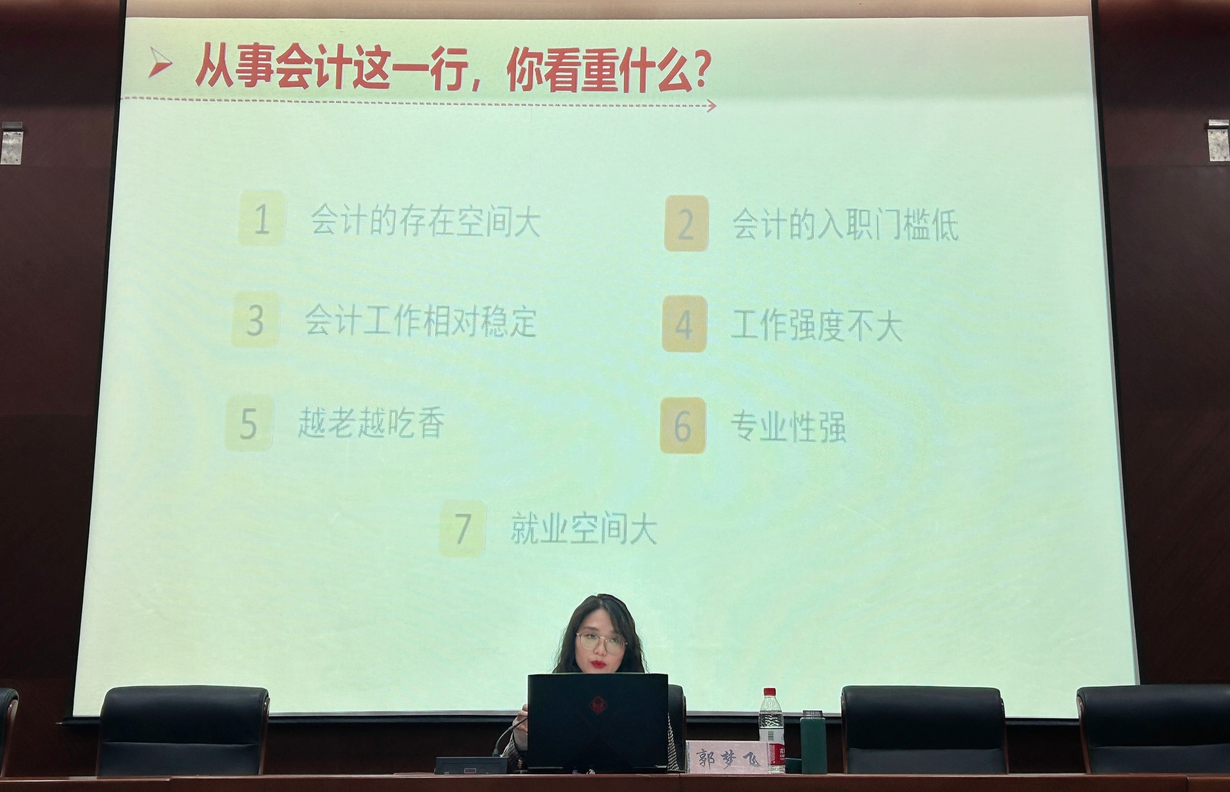 讲座伊始,郭梦飞老师以“从事会计这一行,你看重什么”为切入点,引导学生深入思考会计专业选择的意义,了解会计行业的发展趋势。随后,郭老师从会计工作的基本分类、就业发展方向、基本素养要求和从业技能几个方面展开讲述,并介绍了财会职业的相关证书。针对同学们时下最关注的初级会计职称考试问题,郭老师从报考条件、报名方式、考试内容、备考技巧、学习计划以及考前注意事项几大方面深入剖析、详细讲解。她强调,制定合理的复习计划,保持持之以恒的学习习惯至关重要。建议同学们根据自身实际情况,科学分配时间,提高学习效率,注重知识的系统性和连贯性。希望同学们放松心态,认真备考。讲座现场气氛热烈,同学们纷纷表示受益匪浅。