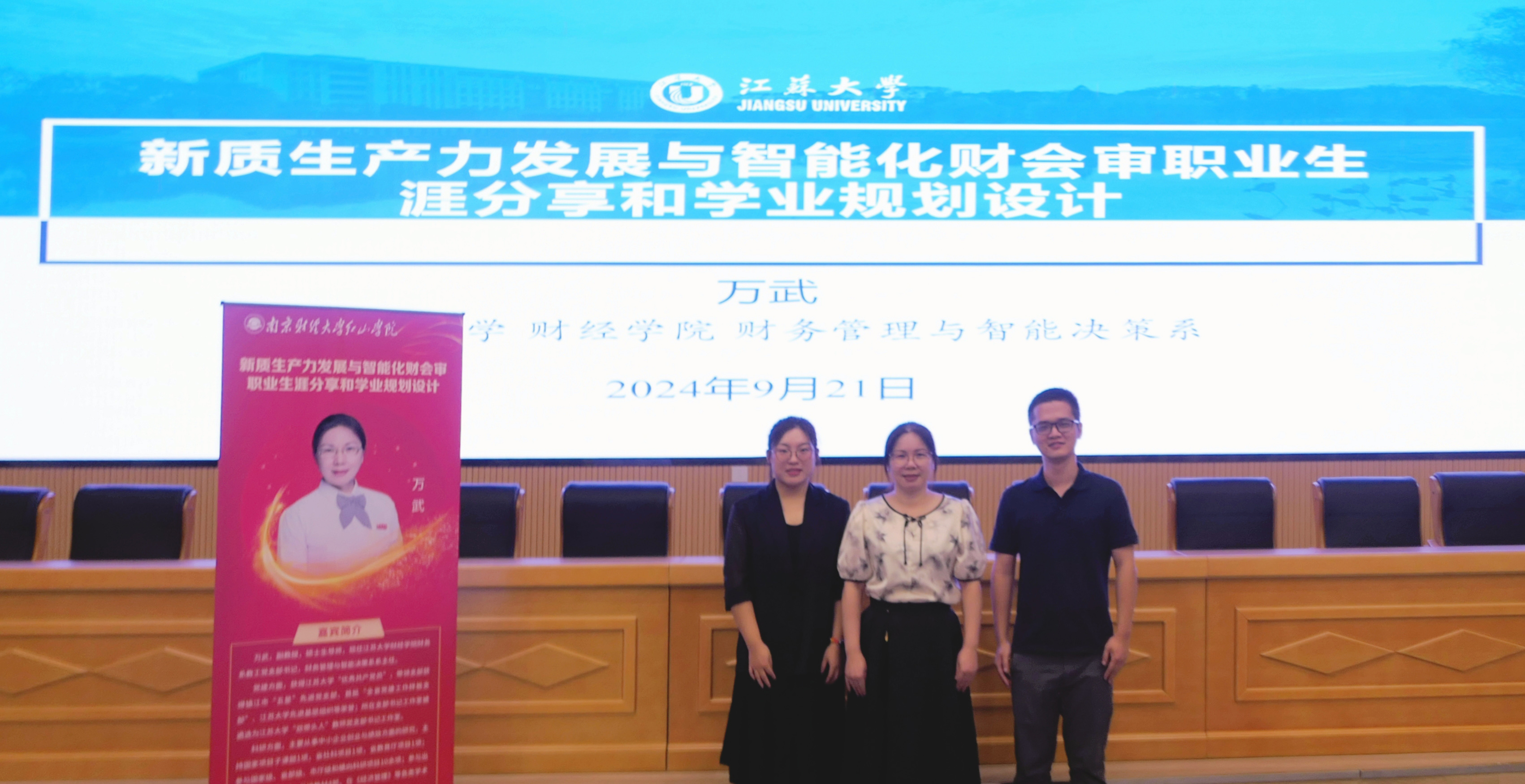 为全力构建就业育人新格局,引导我系2024级新生尽快融入大学生活,尽早制定职业规划,探寻理想的职业目标,9月21日上午,我系邀请了江苏大学财经学院财务系教工党支部书记、财务管理与智能决策系系主任万武教授和国际四大会计师事务所高级税务顾问、人才咨询委员会委员石阳磊先生,分别在高淳校区公教楼第一报告厅和第二报告厅,做题为“新质生产力发展与智能化财会审职业生涯分享和学业规划设计”的讲座。本次讲座由系团总支书记李景程牵头组织,系团总支副书记兼学工秘书吴昊冉、辅导员钱伶俐协助,我系全体2024级新生参与了此次讲座。