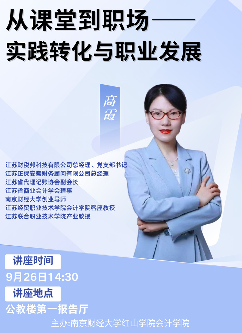 主讲嘉宾:高霞,江苏财税邦科技有限公司总经理、党支部书记,江苏正保安盛财务顾问有限公司总经理,江苏省代理记账协会副会长,江苏省商业会计学会理事,beat365英国官方网站创业导师,江苏经贸职业技术学院会计学院客座教授,江苏联合职业技术学院产业教授。