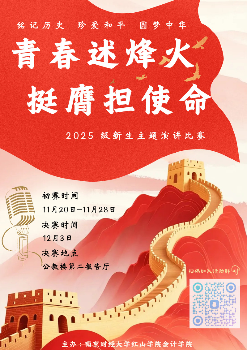 活动内容:今年是中国人民抗日战争暨世界反法西斯战争胜利80周年,为深入挖掘抗战历史红色底蕴,培养青年学生的民族责任感和使命感,在新时代传承与弘扬抗战精神,将面向全体2025级新生举办“青春述烽火,挺膺担使命”主题演讲比赛,鼓励青年学子通过讲述抗战故事与英雄事迹,铭记历史、缅怀先烈、珍爱和平,在强国复兴征程上挺膺担当。