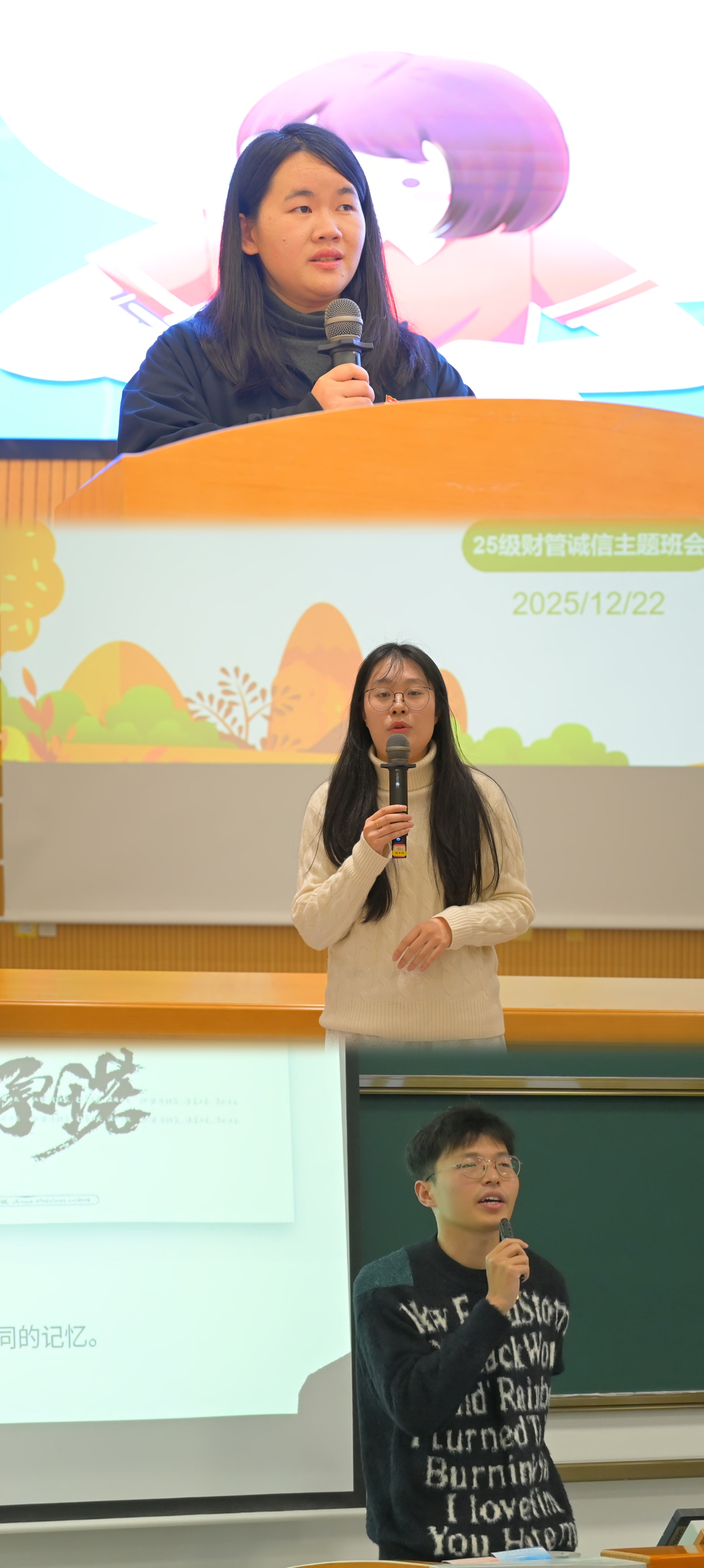 期末考季临近,为筑牢新生考风考纪思想防线,强化诚信应考意识,会计学院组织2025级财务管理、会计学、审计学三大专业开展诚信应考主题教育活动,以沉浸式、互动式、常态化模式筑牢学生思想防线。12月22日至24日,活动在新生辅导员杨静、陈朋、朱诚的指导下先后开展,由会计学院“心连心工作驿站”学生成员主持。