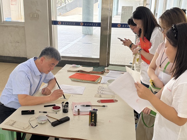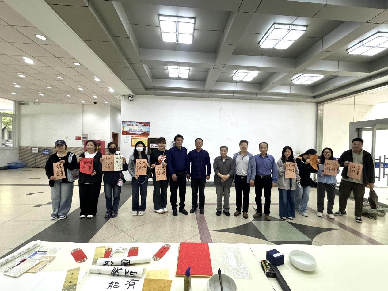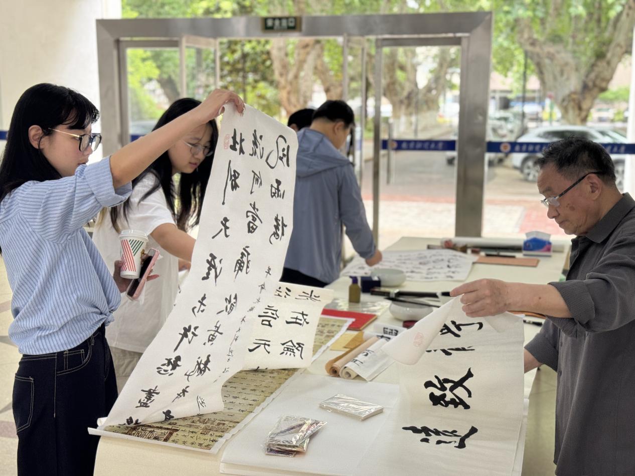 捐赠现场,国际交流处处长黄能、“五老”讲师团成员刘树铭、冯玉川老师等老师现场题写书法作品为捐赠者书写毕业赠语,向捐赠者赠送明信片、书签等精美礼品,图书馆现场为每位捐赠者颁发了捐赠证书。刘树铭先生还精心誊录了《岳阳楼记》书法长卷赠予图书馆。
