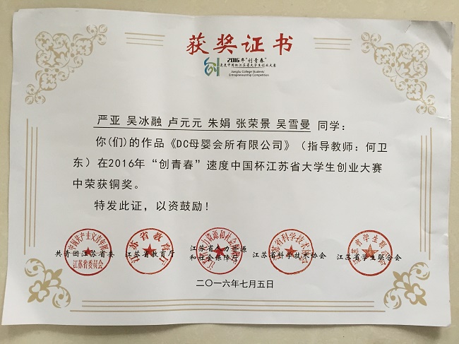 近日,beat365团委从2016年“创青春”江苏省大学生创业大赛组委会秘书处获知喜讯:beat365两件作品荣获2016年“创青春”江苏省大学生创业大赛铜奖。今日,正式收到获奖证书。