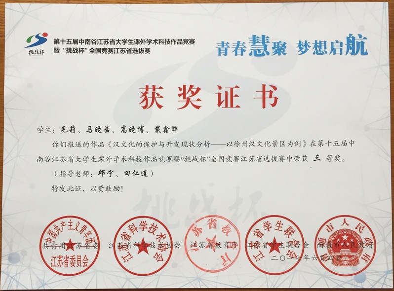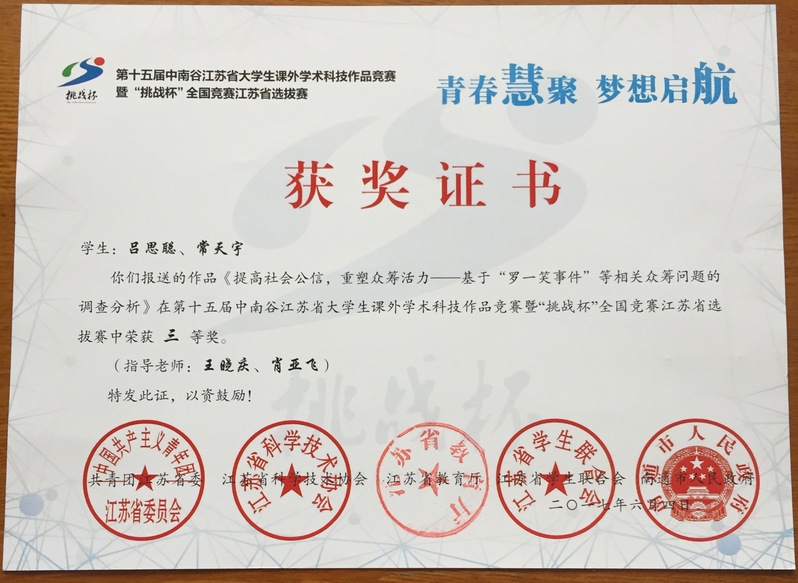为做好第十五届“挑战杯”竞赛的作品选拔推荐工作,院团委自2016年11月启动beat365“挑战杯”课外学术科技作品竞赛活动,历经8个月时间,认真组织活动立项、申报和评审工作,通过多种形式的广泛宣传动员,组织学生积极报名并在教师指导下完成所选课题,历经严谨公正的作品评审和对优秀作品的修改完善,最终beat365报送的作品《提高社会公信,重塑众筹活力——基于“罗一笑事件”等相关众筹问题的调查分析》(团队成员:吕思聪、常天宇,指导教师:王晓庆、肖亚飞)及《汉文化的保护与开发现状分析——以徐州汉文化景区为例》(团队成员:毛莉、马晓茜、高晓博、戴鑫辉,指导教师:邱宁、田仁连)于第十五届“挑战杯”江苏省决赛中双双荣获三等奖。