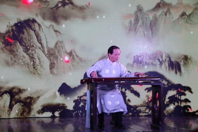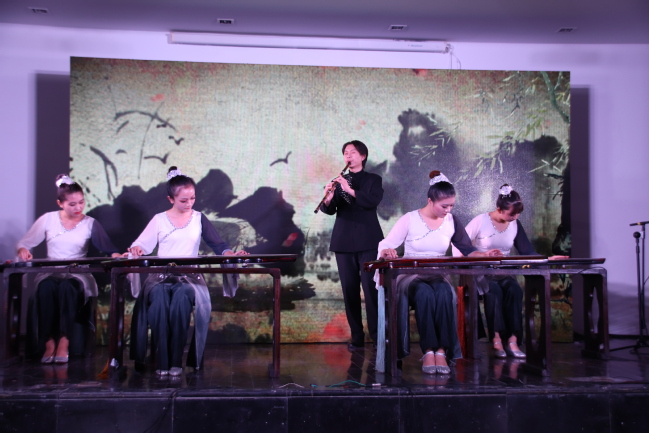随后,马维衡老师倾情演出了古琴独奏“平沙落雁”。一曲完毕,赢得满堂喝彩。压轴曲目是马老师的古琴独奏“大湖茄”,再次使同学领略到且虚且实,绵绵不断的风雅之乐。最后,全体演奏人员在舞台集体亮相,同学报以久久不息的热烈掌声.