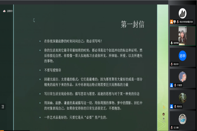 文珍从当下人们所处的生活状态出发,阐明疫情下的四月是艰难的四月,鼓励大家“用诗歌和花朵战胜四月”。她引用作家森见登美彦《春眠小日记》中的句子,赞美四月春日的魅力,鼓励大家记录身边美好。随后,她分享作家里尔克的书信,阐释自己对诗歌和生活的感悟,提醒大家理解生活的复杂,并从中寻找诗意与创造的可能。最后,她引用作家艾略特的经典诗作《荒原》,勉励同学们在复杂的世界中学会安身立命,努力在苦闷之中看见希望之光。