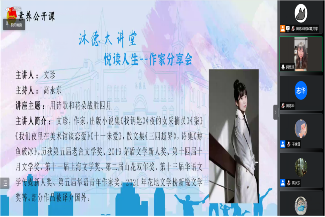 4月20日晚,青年女作家文珍应邀做客beat365“沐德大讲堂”暨“素养公开课”,做题为《用诗歌和花朵战胜四月》的讲座。讲座以线上腾讯会议的方式进行,两千名师生踊跃参会聆听。讲座由学院党委副书记、纪委书记高永东主持。