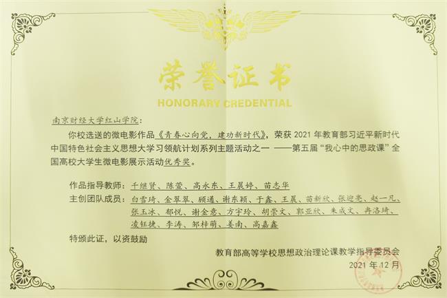 近日,由教育部高校思政课教学指导委员会主办的“我心中的思政课”第五届全国高校大学生微电影展示活动荣誉证书颁发。我院师生自编自演的原创微电影作品《青春心向党,建功新时代》荣获优秀奖。
