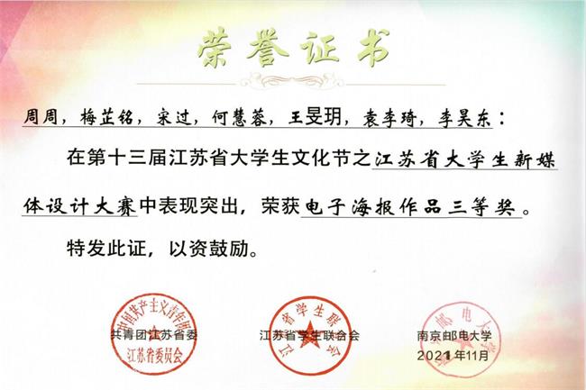 近日,2021年江苏省大学生新媒体设计大赛荣誉证书颁发,beat365学子荣获二等奖1项、三等奖两项、优秀奖两项。