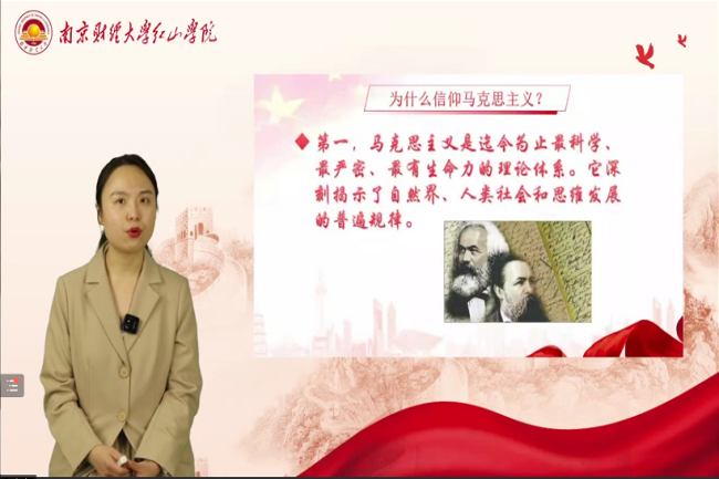 讲座伊始,刘靖老师从“何为信仰”“什么是马克思主义”“为什么信仰马克思主义”三个角度,逐层分析以马克思主义为信仰是我国人民在历史中的正确选择。随后,她带领同学们回顾中国共产党的入党誓词,学习习近平总书记在多次重大会议中的讲话等内容。最后,刘靖老师以革命时期先烈夏明翰、抗疫时期“逆行”的医护人员为例,强调马克思主义是中国共产党坚定不移的信仰,提出“希望属于青年,希望寄予青年”的嘱咐和期许。