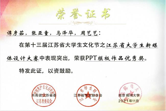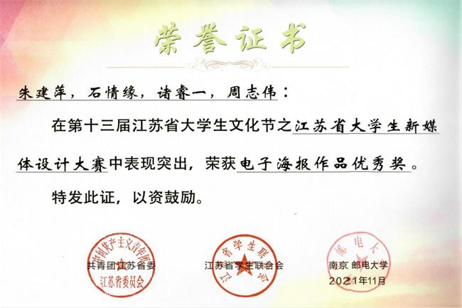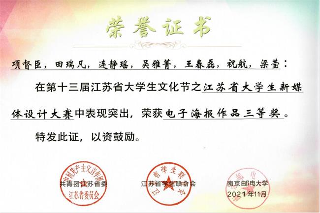 近日,2021年江苏省大学生新媒体设计大赛荣誉证书颁发,beat365学子荣获二等奖1项、三等奖两项、优秀奖两项。