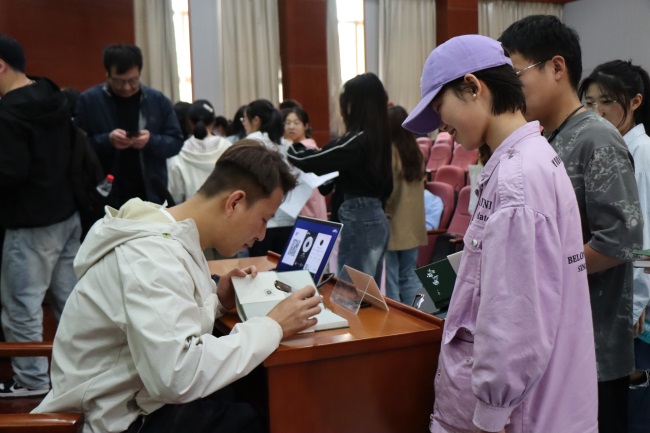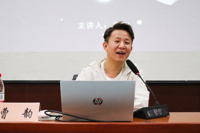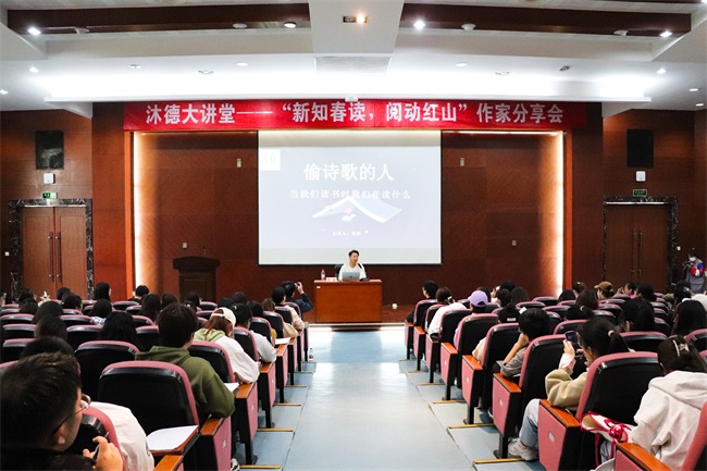 主题分享会上,曹韵以“什么是读书”与“当我们谈读书时我们在读什么”这两个问题切入,从生命、时间、态度等多个角度讲解诗歌,分析了文学阅读中“求真求美求善”的倾向。他和现场师生探讨读书的意义,阐明“给予自己一个读书理由”的重要性,鼓励大家投入阅读,让读书融入生活,从中领悟生命的意义,从而更加自信、充实地走向未来。