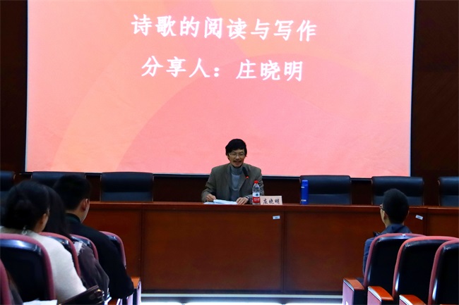 分享会上,庄晓明老师对自己创作诗歌、散文的经历娓娓道来,希望师生从诗歌中感悟生活,从阅读中汲取养分,为学习和生活积累丰富的素材。他以具体的诗歌为例,从说史、说理、说写三方面详细讲解诗歌的连贯性、独特性与标准性,重点讲解诗歌的创作方法。