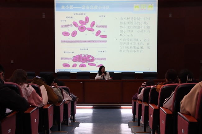 讲座伊始,李婉丽老师指明本次讲座的主要组成部分:血液奥秘、献血释疑、血液制备、政策法规及献血瞭望。随后,她围绕“为什么应该献血”这一问题作出具体阐释并鼓励同学们积极参与到献血活动中来。接着,李婉丽老师向同学们讲述具体用血人群和普及献血后的注意事项。讲座过程中,同学们认真聆听,现场秩序稳定,氛围活跃。