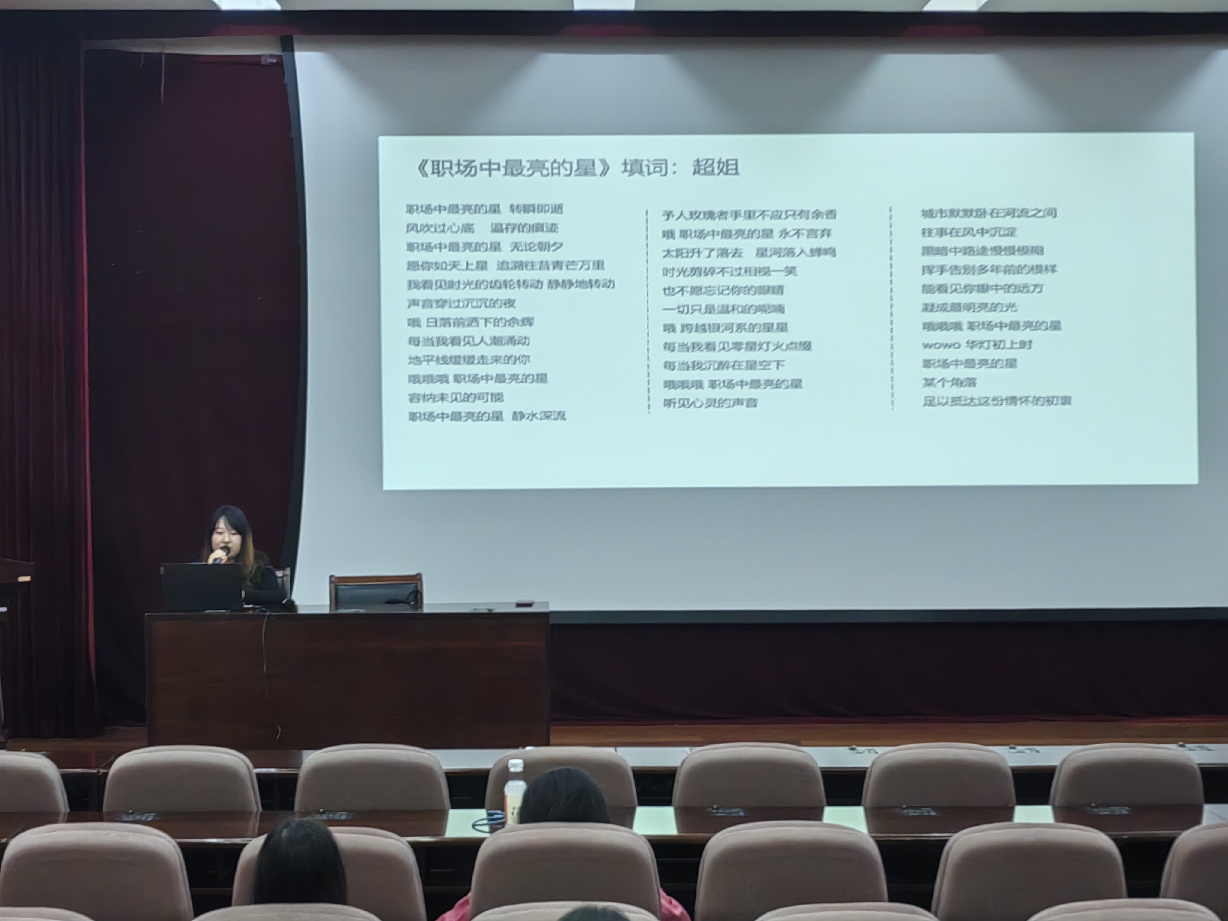 任超讲师以一首名为《职场中最亮的星》的歌词作为结尾,鼓励学生们在职场中寻找自己的定位,成为最耀眼的星。整场培训活动内容丰富、实用,受到了参与学生的广泛好评。