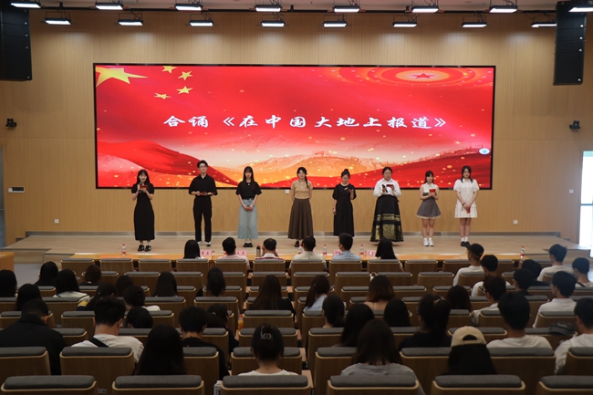 合诵环节,八位参赛选手共同朗诵《我在中国大地上报道》,铿锵有力的青春语言诉说着祖国发展壮大的光辉历史,展现了青年人的青春誓言。