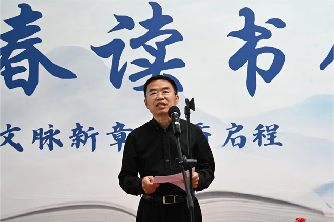 戴昕副院长致辞。他深入讲解阅读的本质,并提出三点期望:以书为友,在经典中扎根,涵养“终身阅读“的习惯;以书为刃,在思辨中破茧,锤炼“独立批判“的思维;以书为桥,在实践中远行,践行“知行合一”的追求。