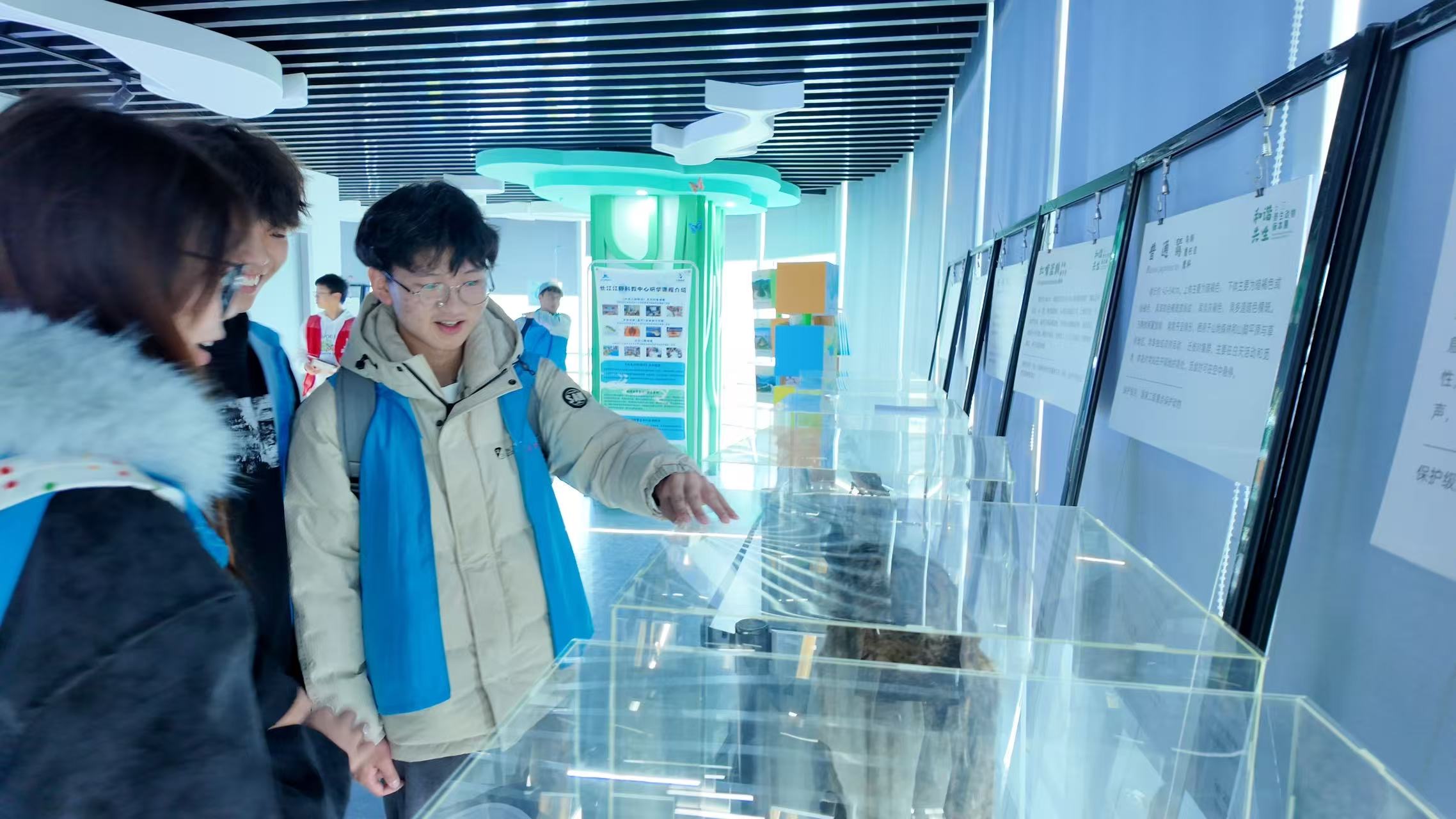 进入长江江豚科教中心,在工作人员的引导下,宣讲团成员沉浸式参观了标本陈列展区,开启了一场长江生物探秘之旅。展区内,中华鲟、碧凤蝶、黄边鬼艳锹甲等珍稀生物完整标本静静陈列,成员们直观了解到长江流域生物多样性,深刻体会每一种生物在生态链中的重要价值,也更明晰了生物多样性保护的紧迫性。在科教中心影音厅,成员们集体观看了长江生态保护主题短片,深入学习江豚种群保护、长江禁渔等生态修复举措。观影结束后,成员们还围绕长江流域生态环境、江豚生活习性及数量等知识进行答题,进一步坚定了以宣讲传递生态理念、以行动守护长江家园的决心。