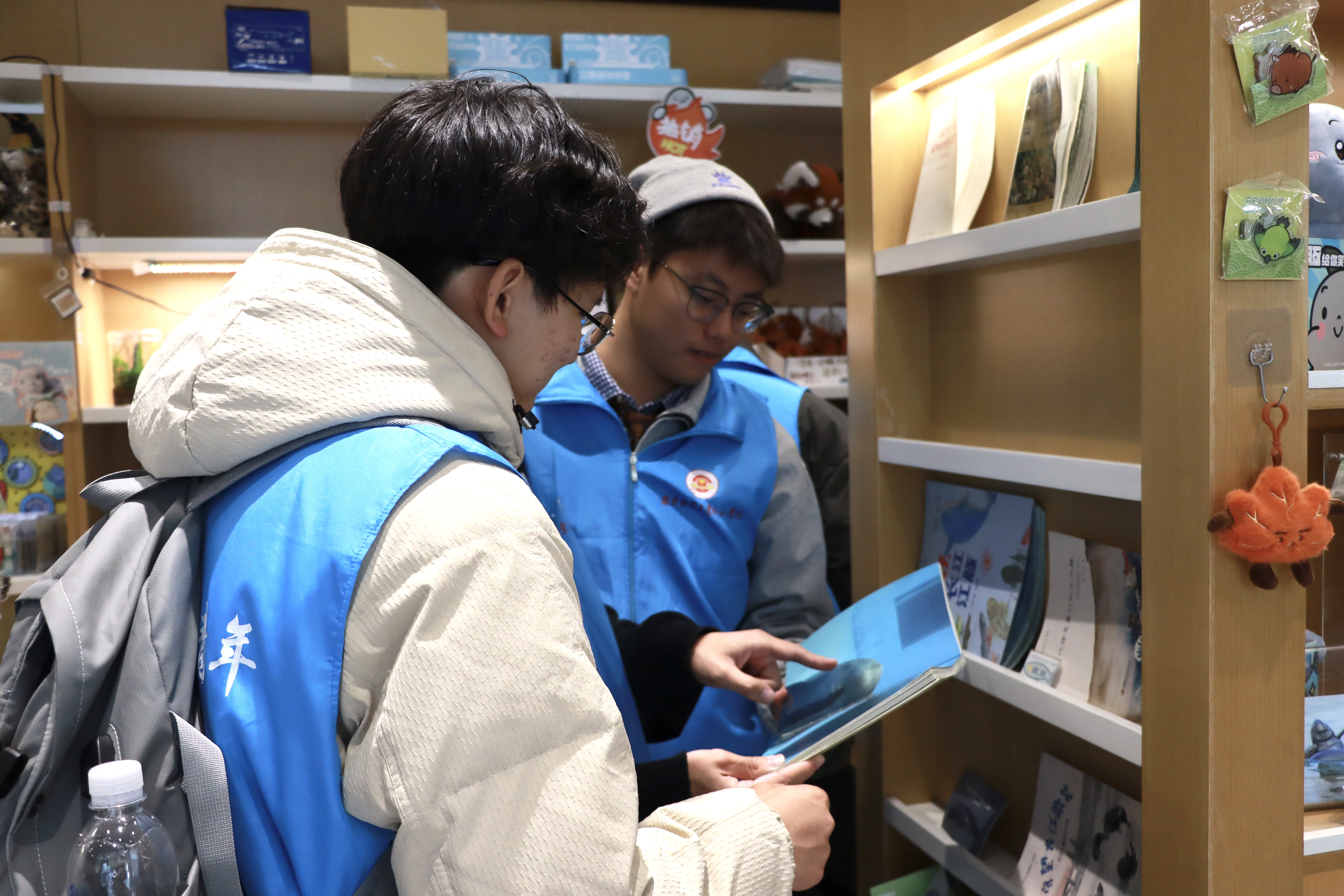 在结束江豚实地观测后,宣讲团到访南京江豚书屋,这里既是传播江豚保护知识的窗口,也是凝聚生态保护力量的阵地。江豚书屋的档案区内,陈列着数十年来长江生态变迁的珍贵记录,墙上悬挂着江豚摄影作品,每一处细节都传递着“守护江豚、共护长江”的理念。成员们穿梭在书架之间,观看江豚保护主题展览,深入了解长江生态治理的更多细节。在文创展示区,各式各样的江豚主题产品吸引了队员们的目光,从憨态可掬的毛绒玩具到精美的江豚邮票,从创意笔记本到环保手提袋,保护理念正通过这些日常物品悄然传递。