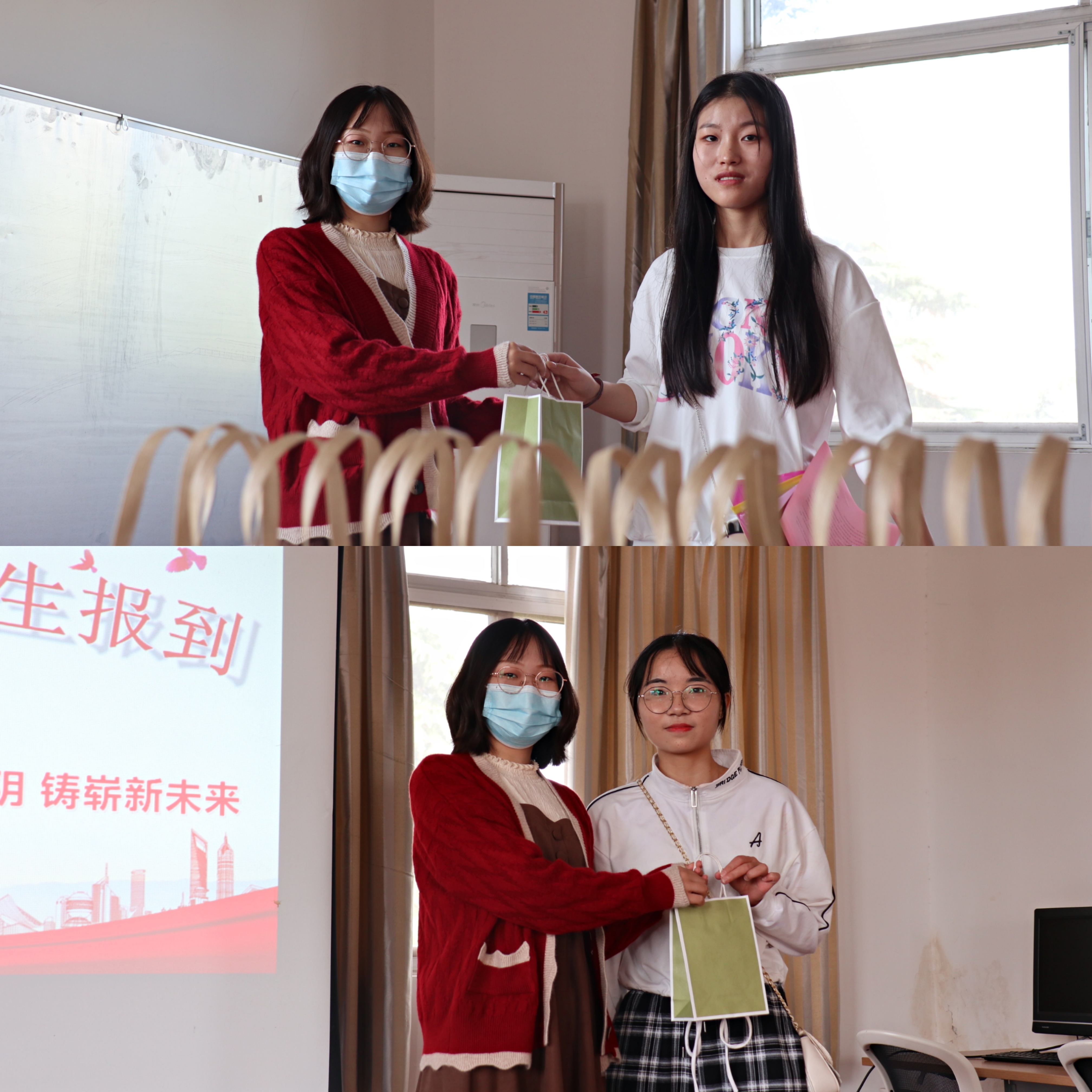为迎接新生,文法系还准备了一些特色活动,新生辅导员李子钰在教务楼四楼悬挂了书法作品迎接新生入学,此外,文法系老师还贴心地为每一位新生准备了小礼品和小零食,并选取了15个有意义的数字,例如“72”代表中华人民共和国成立72周年,“100”代表中国人民共产党建党100周年,给相应顺序报到的同学分发幸运礼袋,让他们入学第一天就感受到了大学的温暖。