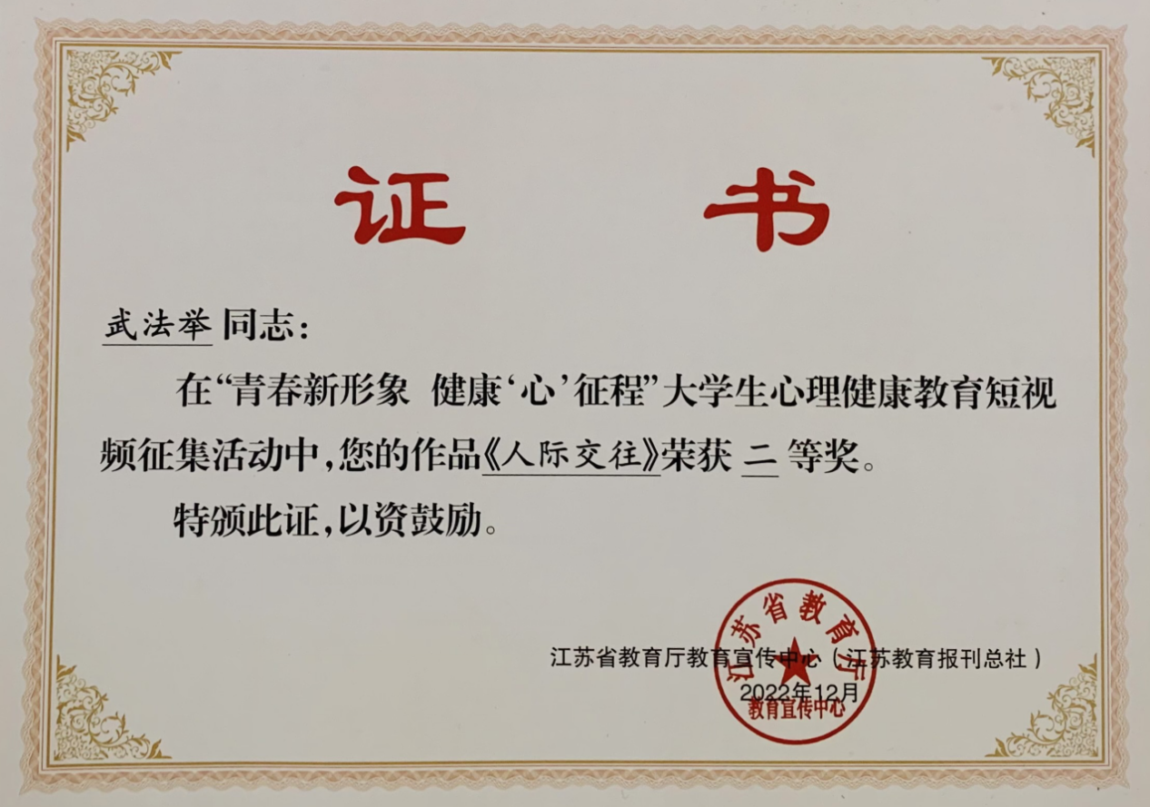 近日,江苏省教育厅教育宣传中心(江苏教育报刊总社)公布了“青春新形象,健康‘心’征程”大学生心理健康教育短视频征集活动获奖名单。其中,beat365营销2253武法举同学拍摄的《人际交往》荣获二等奖。本次活动有效推动了我省大学生心理健康教育工作的发展,也进一步引导大学生树立自尊自信、理性和平、积极向上的良好形象,积极关注心理健康,争做时代好青年。