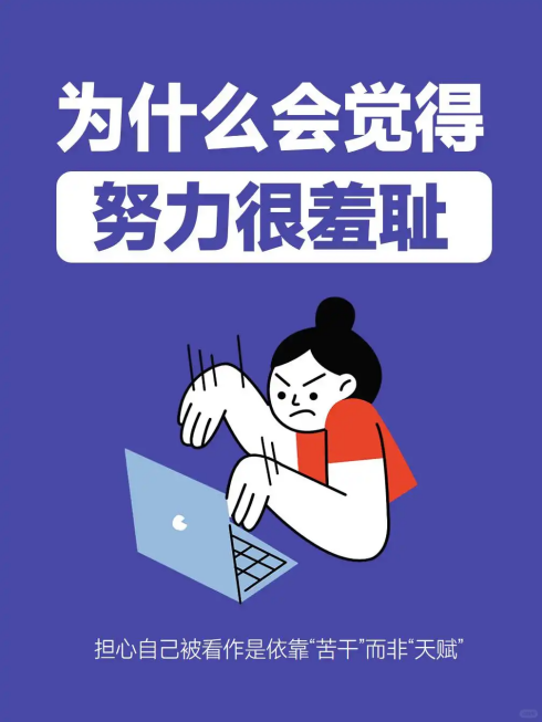 A:这是由于有些人害怕即便付出了巨大的努力,最终仍然可能无法达到预期的目标,这种对失败的担忧让一部分人觉得努力是一种潜在的公开羞辱,他们不愿意被人看到尝试但未成功的过程。另一方面,在某些文化或环境中,人们可能过分强调天赋和自然能力的重要性,而将努力视为不够聪明或有才华的表现。这种观念可能导致个体在努力时感到羞愧, 担心自己被看作是依靠“苦干”而非“天赋”。