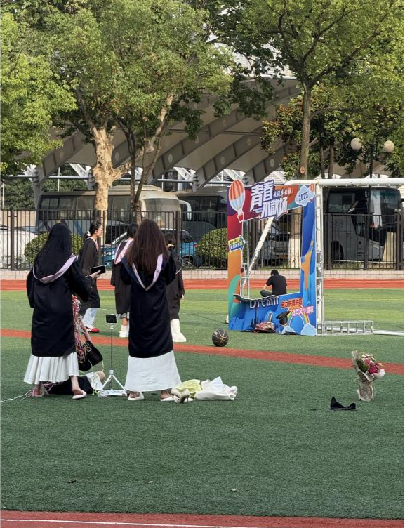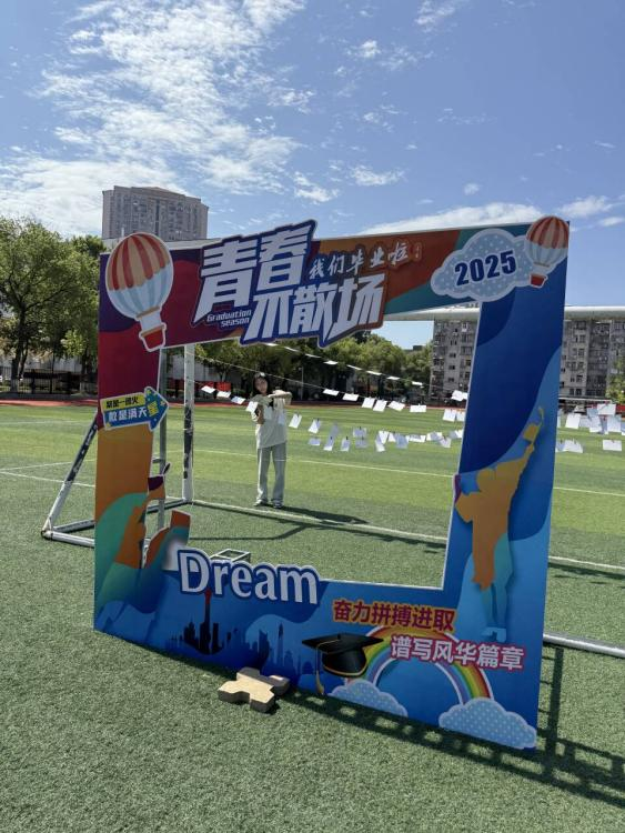 毕业相框打卡区同样人气爆棚。大学生心理咨询中心在操场球门前设置了大型毕业相框,寓意着毕业进球、达成人生成就。毕业生们穿上学士服,与同窗好友、师长在相框中合影留念,快门按下的瞬间,将灿烂的笑容和难忘的校园时光定格。