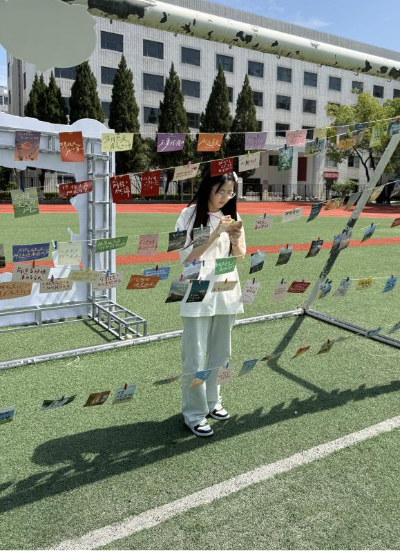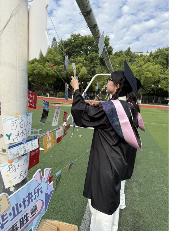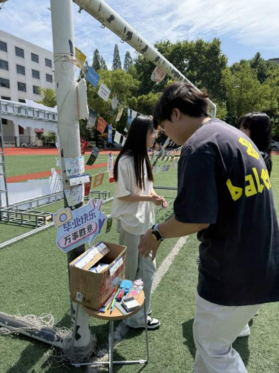 在明信片长廊,毕业生们纷纷驻足,拿起笔写下对过去的怀念与对未来的期许。长绳上挂满了印有美好祝福语的明信片,背后的留言里更满是深情。有人回忆着课堂上老师的谆谆教诲,有人感谢室友四年来的陪伴,也有人写下对未来职业的憧憬。“愿此去前程似锦,再相逢依旧如故”“希望未来的自己,能永远保持这份热爱与勇气”,一句句真挚的话语,在微风中轻轻摇曳,诉说着青春的不舍与坚定。