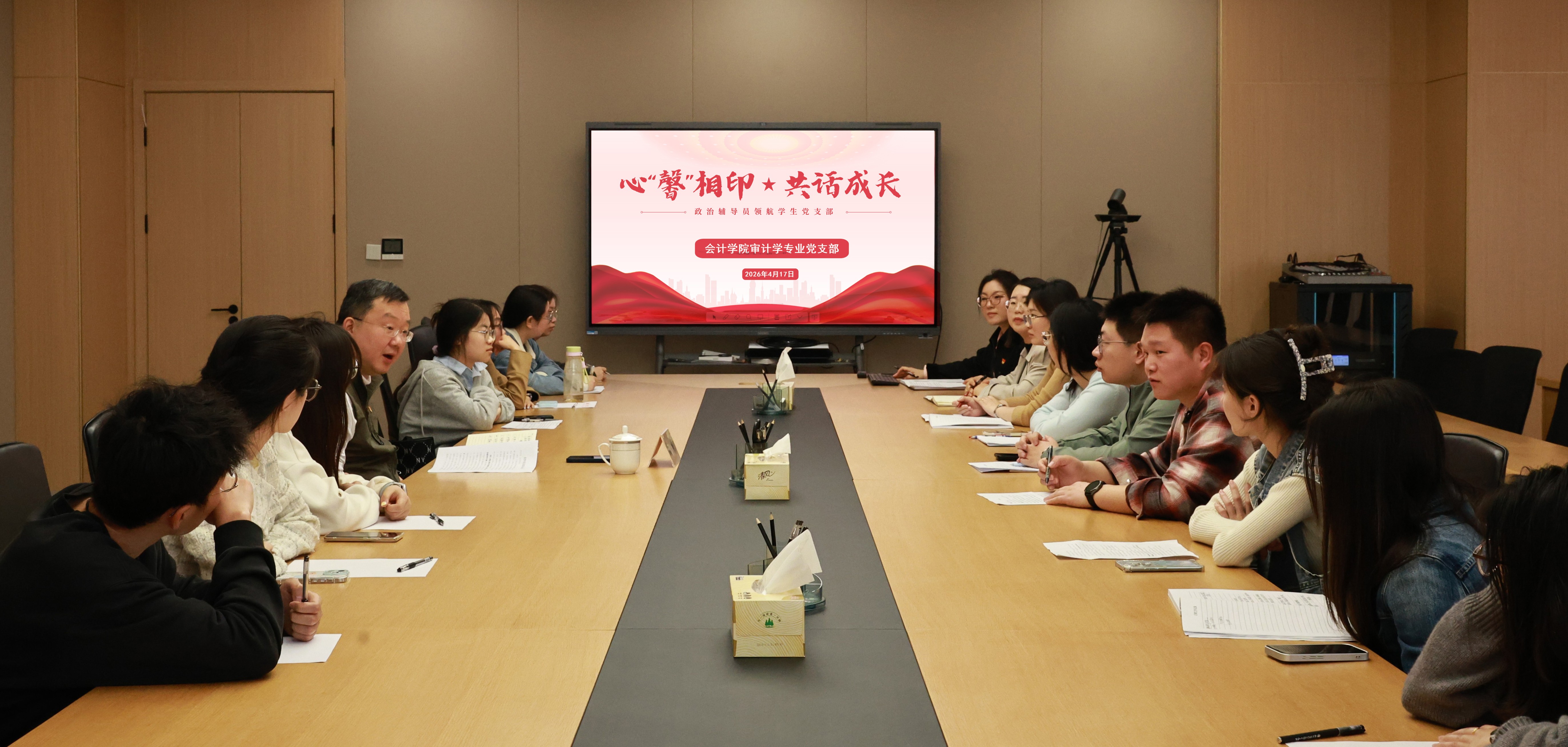 为深入倾听师生心声、强化党员党性修养、凝聚支部奋进力量,4月17日上午,会计学院审计学专业党支部在图书馆620会议室召开师生党员座谈会。支部“政治辅导员”、学院党委书记孙彬出席会议,会议由支部书记吴昊冉主持。会计学院党总支副书记王颖及支部全体师生党员参加。