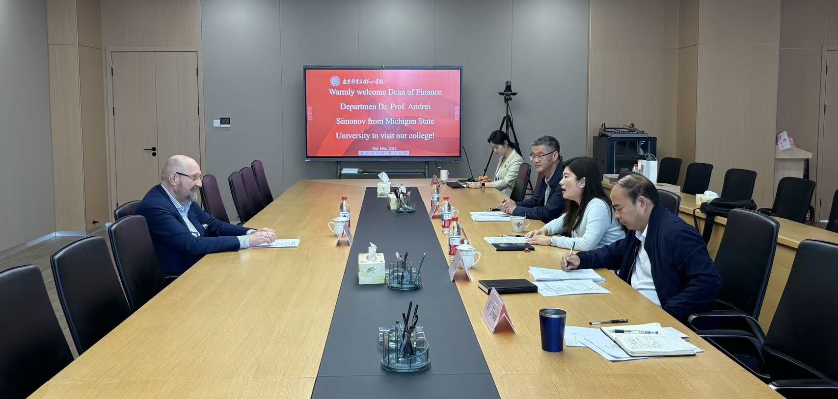 10月16日上午,美国密歇根州立大学金融系主任 Andrei Simonov教授来访beat365。学院副院长程宏云在图书馆第一会议室接待来宾,国际交流合作处处长黄能,金融税收学院院长郭文旌及国际交流合作处相关人员参加会谈。双方就国际合作项目展开深入交流。