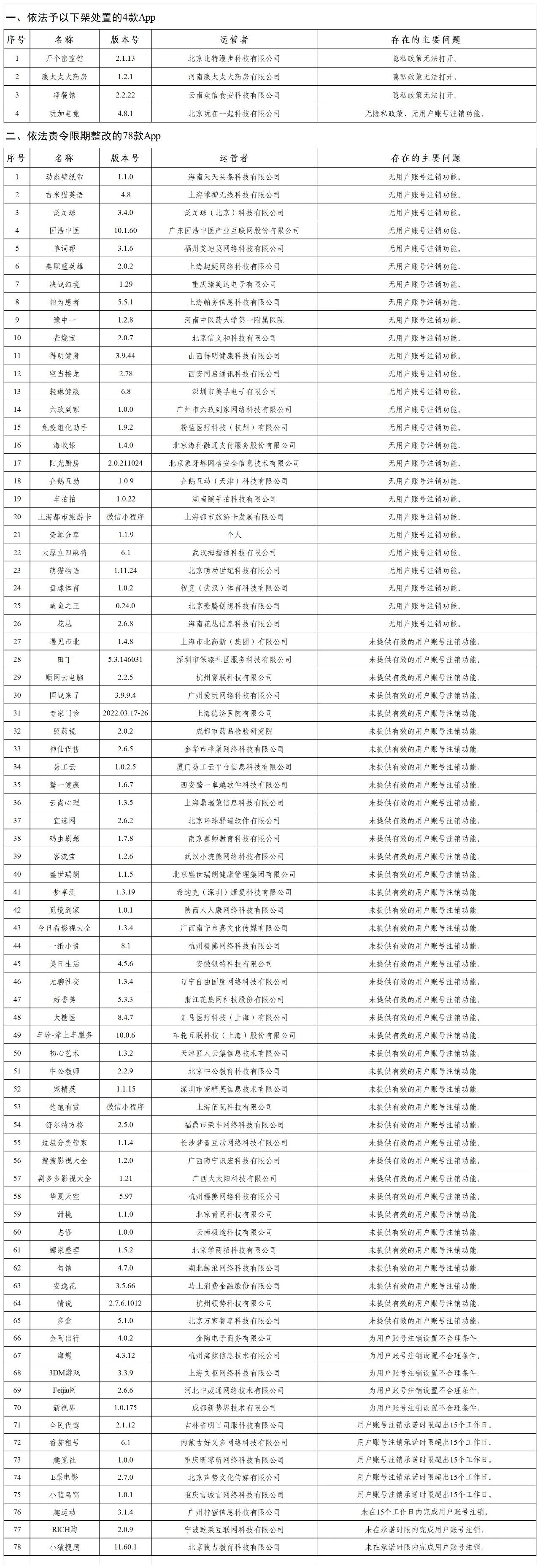 和责令限期整改的78款App清单