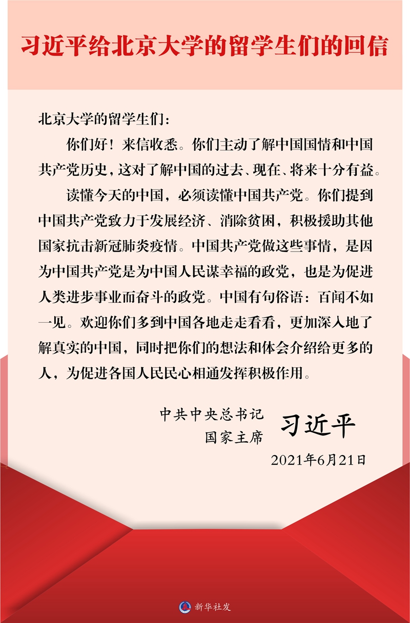 中共中央总书记、国家主席习近平6月21日给北京大学的留学生们回信,鼓励他们更加深入地了解真实的中国,把想法和体会介绍给更多的人,为促进各国人民民心相通发挥积极作用。