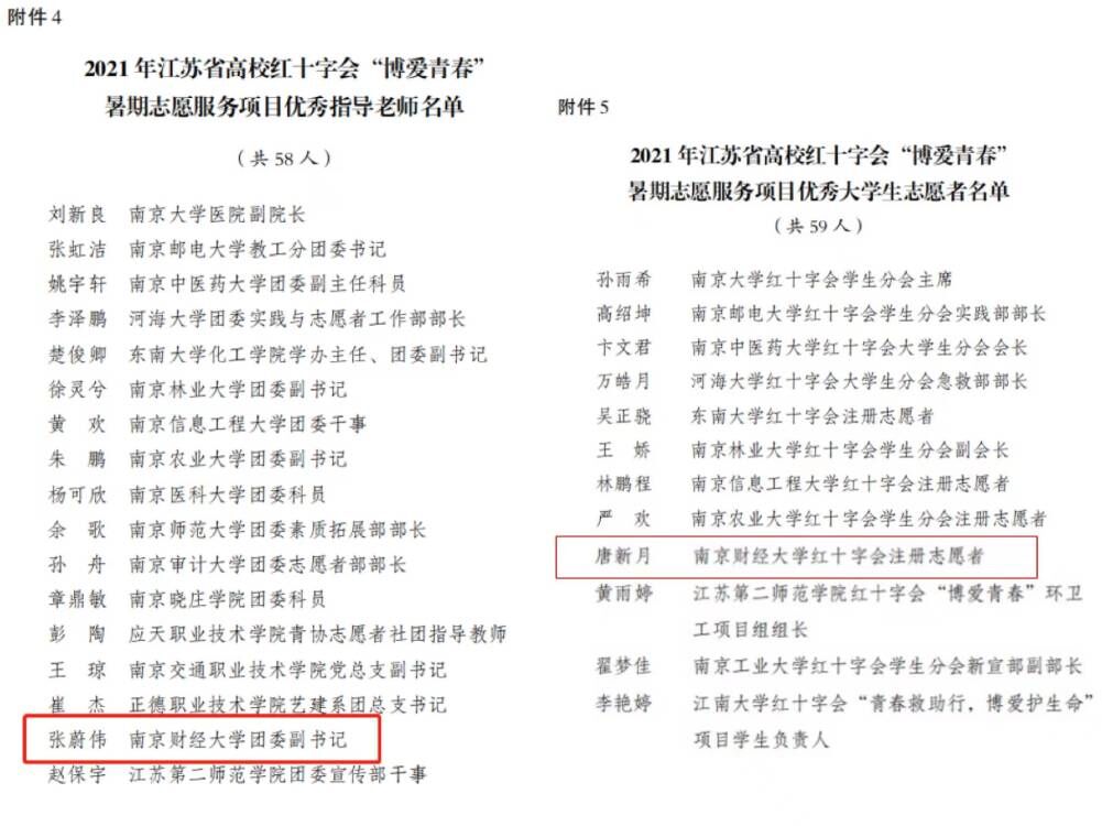 近日,江苏省红十字会等多部门联合开展的2021年江苏省高校红十字会“博爱青春”暑期志愿服务项目展示总结活动中,我校《一见青心,爱越山海》项目脱颖而出,入选省级支持项目,校团委副书记张蔚伟获评“优秀指导老师”,国贸2001班唐新月同学获评“优秀大学生志愿者”。